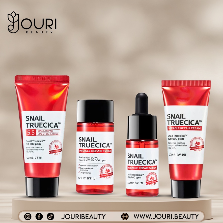 مجموعة سنايل تروسيكا ميراكل لإصلاح البشرة من سوم باي مي هي مجموعة عناية كاملة تم تصميمها خصيصًا لإصلاح وتجديد البشرة المتضررة بفضل تركيبتها الغنية بمستخلص الحلزون وTruecica™ الفعّال. تساعد هذه المجموعة في تهدئة البشرة، تحسين مرونتها، وتخفيف آثار حب الشباب والندبات.