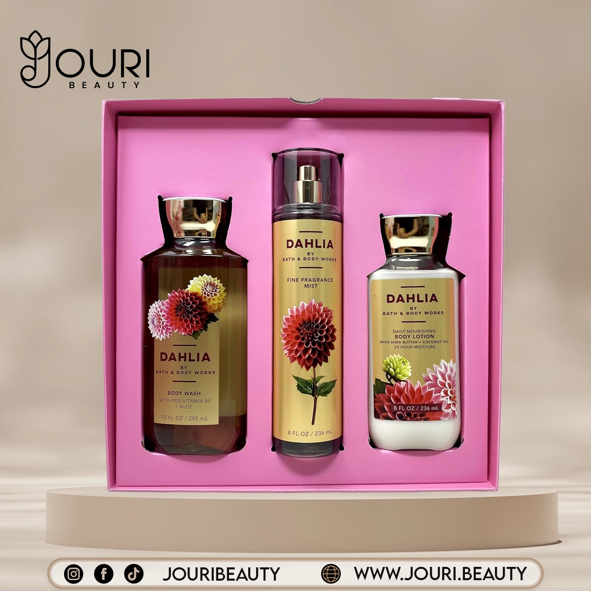 Bath & Body Works Dahlia Gift Set - Luxurious floral scent with dahlia petals, crisp pear & praline Includes shower gel, body lotion & fragrance mist. The perfect long-lasting gift