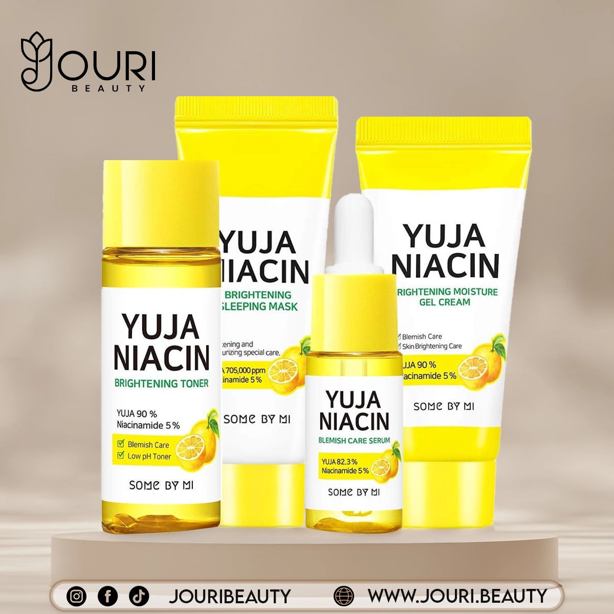 تحتوي المجموعة على عصير يوجا طبيعي غني بفيتامين C لتفتيح وتوحيد لون البشرة. النياسيناميد يقلل البقع الداكنة والتصبغات، بينما يرطب حمض الهيالورونيك البشرة بعمق، مما يزيد نضارتها ومرونتها.